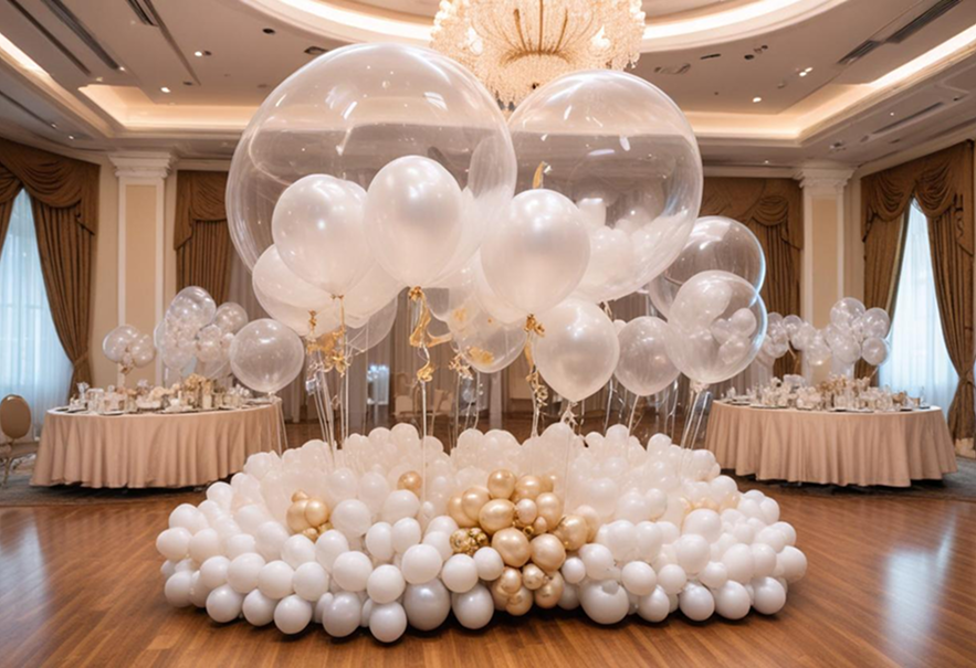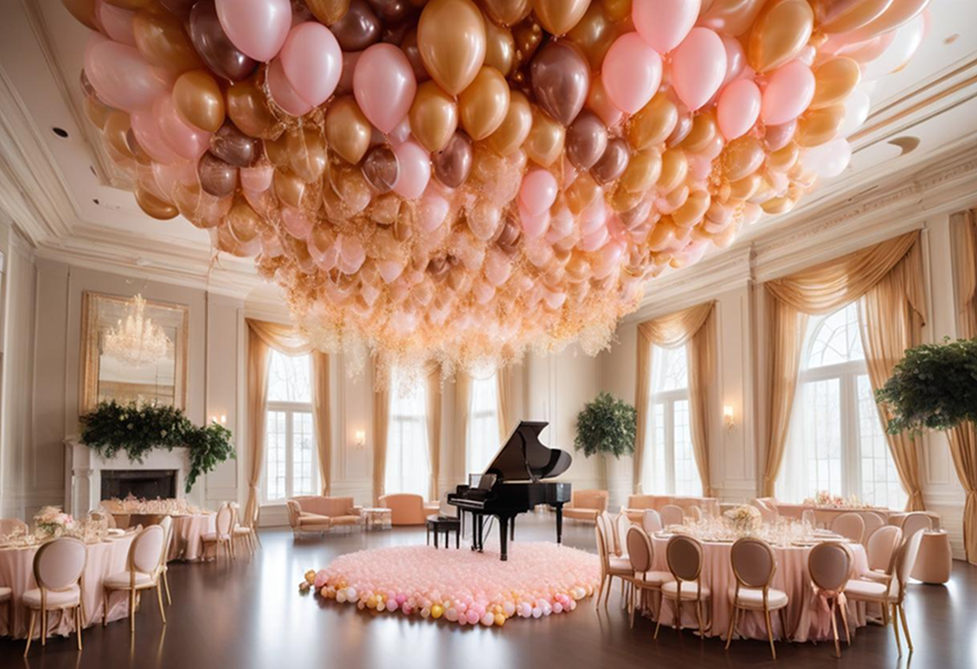 This decor option is perfect for weddings, galas, or birthday parties, where a dramatic and immersive atmosphere is desired. The balloons can be arranged in clusters, patterns, or even left to float freely to create a dynamic visual effect.